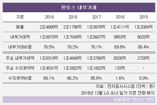 금융감독원 전자공시시스템에 따르면 판토스는 지난해 2조4808억 원의 매출 중 1조8973억 원을 내부거래로 벌어들여 내부거래비중이 76.5%를 기록했다. 전년과 비교해 내부거래 매출이 11.3% 증가했지만 매출이 13.8% 늘면서 내부거래비중은 2018년 78.2%에 비해 소폭 하락했다.