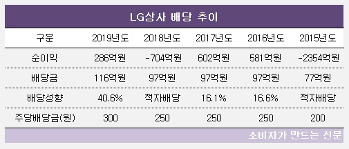 LG상사는 2019년 회계연도 배당을 실시하면서 지배기업 순이익 286억 원을 기준으로 116억 원을 배당했다. 배당성향은 40.6%다. 2018년도에는 700억 원 적자를 냈지만 100억 원 가까운 금액을 배당했다. 판토스는 2018년에는 504억 원의 순이익을 내면서 LG상사 순이익 적자를 메우는데 역할을 했다.
