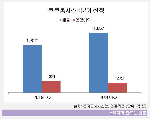 금융감독원 전자공시시스템에 따르면 쿠쿠홈시스의 1분기 매출액은 전년 대비 26.4% 늘어난 1657억 원을 기록했다. 영업이익은 14.8% 감소한 273억 원이다.