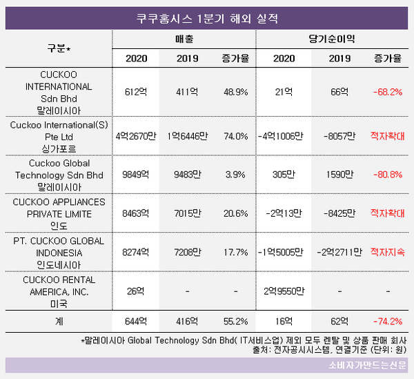 쿠쿠홈시스 측은 "말레이시아의 경우 올 1분기에 환율 변동폭이 커서 외화 환산 손실이 회계상 반영됐다"며 "싱가포르, 인도, 인도네이시아의 경우 사업 초기 단계라 시장 확장성을 보고 투자하고 있는 것"이라고 말했다.