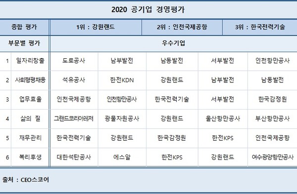 인천국제공항공사와 한국전력기술은 재무관리와 업무효율 무문에서 우수한 성과를 기록하며 각각 종합평가 2, 3위에 올랐다. 한국도로공사와 한국석유공사, 그랜드레저코리아(GKL) 등은 일자리창출, 사회형평채용, 삶의 질 부문에서 두각을 나타내며 부문별 우수기업에 뽑혔다.