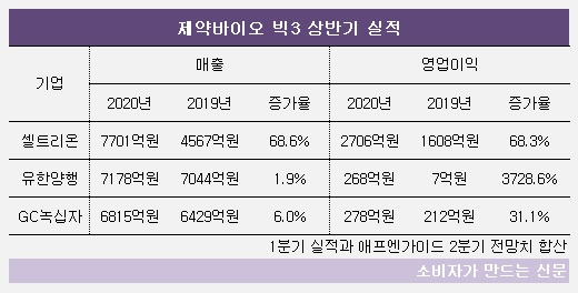 지난해 상반기만 해도 유한양행 매출은 셀트리온보다 2500억 원가량 많았는데, 올 상반기에는 500억 원 가량 뒤처질 것으로 전망된다. 셀트리온은 상반기 매출이 전년 동기보다 68.6%나 증가한 7701억 원에 이를 것으로 추산된다.