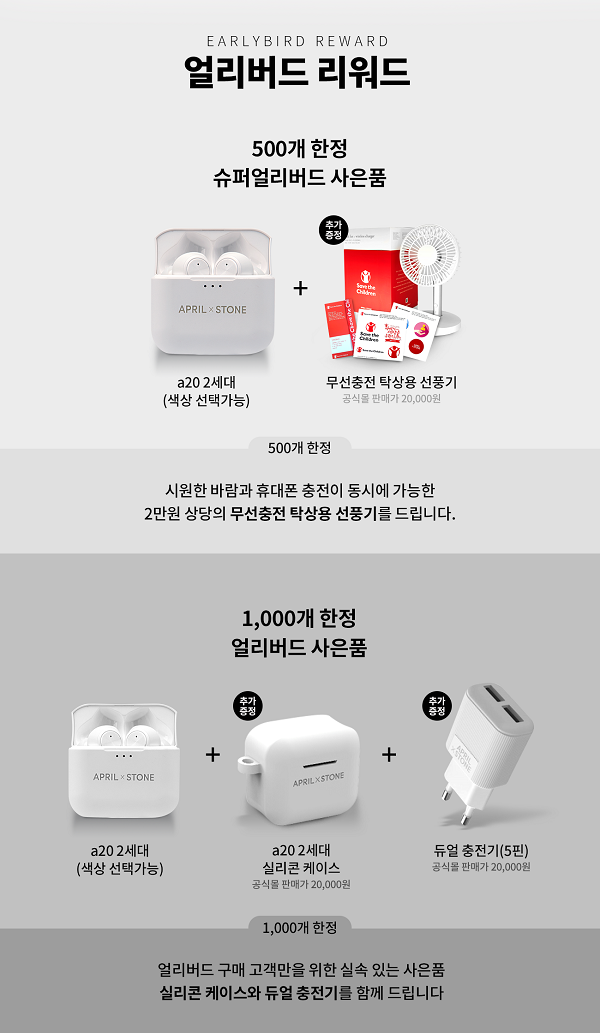 에이프릴스톤은 이와 함께 제품 구매 후 리뷰를 남긴 고객 500명에게 선착순으로 스타벅스 기프티콘을 선물하고, 우수 리뷰 고객을 선정해 에이프릴스톤 보조배터리 및 스피커를 증정할 계획이다.