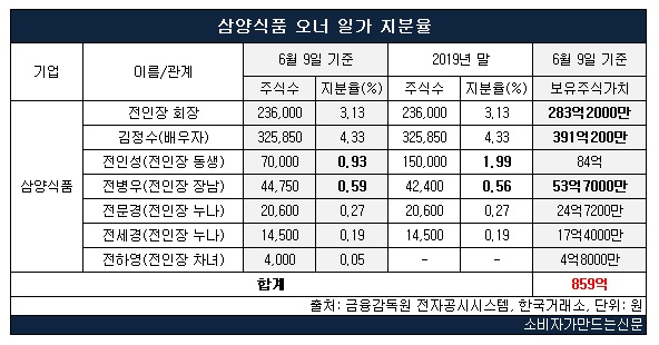 삼양식품 최대주주인 삼양내츄럴스는 2019년 말 기준 전인장 회장과 김정수 전 사장이 각각 지분 21%와 42.2%를 보유 중이다. 또 두 사람의 장남 전병우 해외사업본부 부장이 에스와이캠퍼스를 통해 26.9%를 보유, 여기에 삼양내츄럴스 자기지분(9.9%)을 포함하면 오너일가가 100% 지배하고 있는 구조다. 비글스에서 사명을 변경한 에스와이캠퍼스는 전병우 씨 개인회사다.