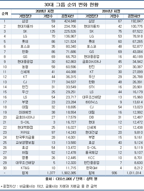 삼성과 현대차, SK, LG, 롯데, 포스코 등 상위 6개 그룹의 순위는 10년 전과 동일했다. 10년 사이 SK와 LG, 롯데는 공정자산 규모 100조 원 그룹 대열에 합류했다.