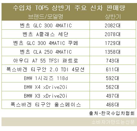 메르세데스-벤츠 BMW 아우디 폭스바겐 쉐보레 등 5대 수입차 업체의 10개 신형(상반기 기준) 모델 중 가장 우수한 성적을 올린 제품은 메르세데스-벤츠의 GLC 300 4메틱으로 상반기에만 2082대를 팔았다.