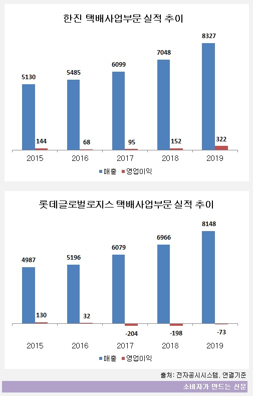 한진은 2017년 매출액 5130억 원에서 지난해 8327억 원으로 매년 상승해왔다. 롯데글로벌로지스 역시 같은기간 매출액 4987억 원에서 8148억 원으로 비슷한 성장세를 보였다.