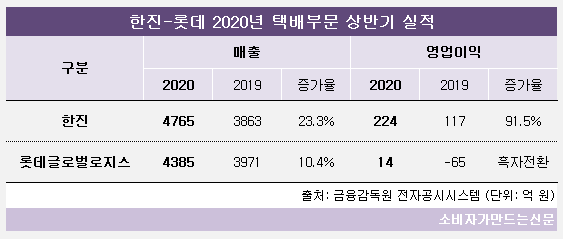 금융감독원 전자공시시스템에 따르면 한진의 올 상반기 택배부문 매출액은 4765억 원으로 전년 3863억 원에서 23.3% 증가했다. 영업이익은 224억 원으로 전년 117억 원에서 91.5% 올랐다.