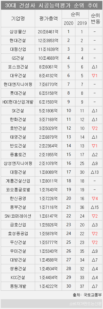 이번 시공능력평가에서 상위 30위권에 이름을 올린 건설사 대부분은 지난해 대비 순위 변동 폭이 크지 않았다. 14개사는 증가했고 7개사는 하락했으며 9개사는 지난해와 동일한 순위를 유지했다.