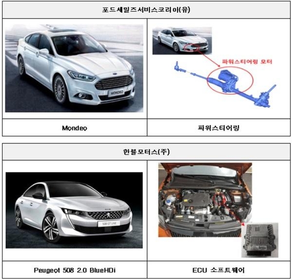 한불모터스에서 수입·판매한 푸조 508 2.0 BlueHDi 등 7개 차종 1313대는 엔진 전자제어장치(ECU)와 질소산화물 센서 간 통신 설정값 오류가 확인됐다. 질소산화물이 정상적으로 배출됨에도 이를 비정상적으로 배출하는 것으로 잘못 인식해 간헐적으로 시동이 꺼질 가능성이 있다.