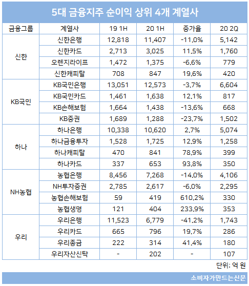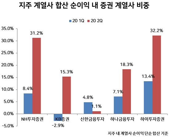 지주 내 수익 대부분을 차지하는 은행 계열사들이 코로나19 여파로 올해 상반기 대규모 충당금을 쌓으면서 수익성이 줄었지만, 거래수수료 수익이 급증한 증권사들이 이를 메우고 있는 양상이다.