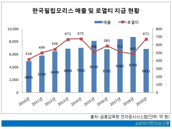 한국필립모리스(대표 백영재)는 최근 10년간 연평균 매출의 8% 수준인 5569억 원 규모의 로열티를 본사에 지불했으며 지난해는 매출이 감소했음에도 로열티는 더 많이 지급해 매출 대비 로열티 비중이 10% 수준에 근접했다. 국내 기업의 로열티가 보통 순 매출액의 2%~5%가량 책정하는 것과 비교하면 매우 높은 수준이다.