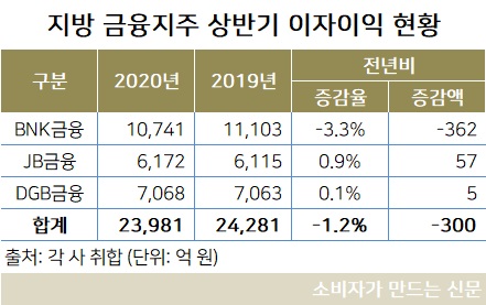 4일 각 사 자료에 따르면 BNK금융 JB금융 DGB금융등 지방 금융지주 3곳의 상반기 순이익 총액은 6842억 원으로 전년 대비 9.6%(727억 원) 감소했다.