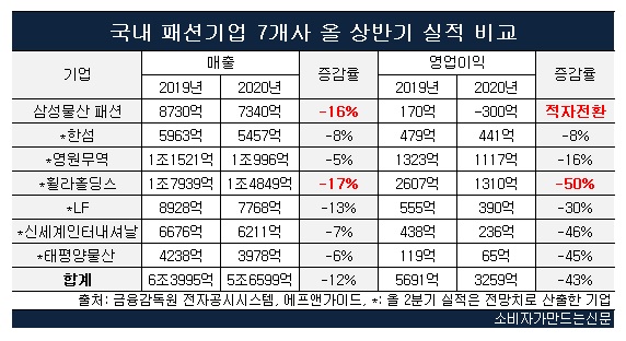 지난해 매출 기준 상위 10개사 가운데 패션사업부문 실적을 별도로 공시하지 않거나 2분기 증권가 전망치가 나오지 않는 이랜드월드‧코오롱인더스트리FnC‧신성통상을 제외한 7개사의 상반기 실적을 집계한 결과 매출 5조6599억 원, 영업이익은 3259억 원으로 전년 동기 대비 각각 12%, 43% 급감했다.