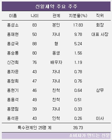 이 기간 이들의 주식 매도로 오너 일가 24명이 보유한 주식은 469만6524주에서 36만5635주가 줄었다. 신일제약 총발행주식의 3.36%에 해당하는 규모를 매각한 것이다. 이에 따라 홍성소 회장 등 특수관계자 지분율은 3월 말 기준 43.1%에서 39.7%로 낮아졌다.