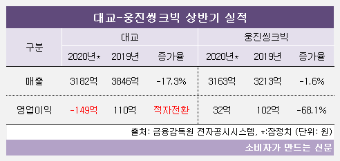 웅진씽크빅은 지난해 상반기 영업이익 193억 원을 냈으나 올 상반기에는 161억 원 줄어든 32억 원을 기록했다. 같은 기간 대교는 205억 원 흑자에서 –149억 원 적자로 영업수지가 354억 원이나 악화됐다.