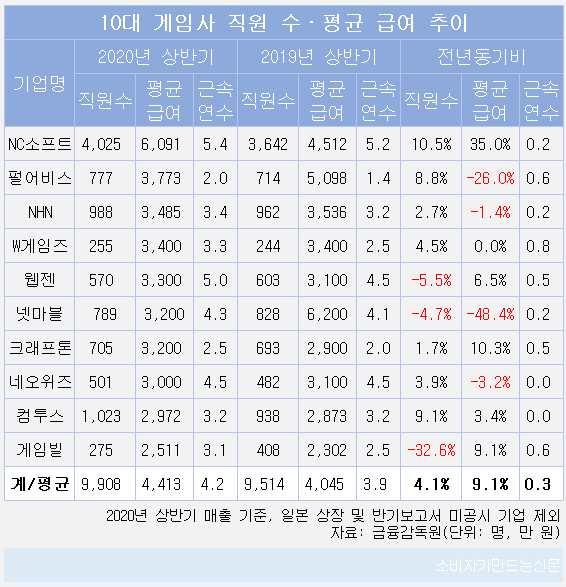엔씨소프트는 올 상반기에 직원 1인당 평균 급여로 6000만 원 이상을 지급해 3000만 원대에 그친 경쟁사들과 큰 격차를 보였고, 게임빌(대표 송병준)은 평균 급여가 2500만 원으로 10대 게임사 가운데 최하를 기록했다.