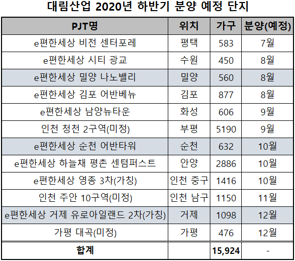 같은 달 인천 부평구 청천동에서는 청천 2구역 재개발단지 5190가구 분양이 예정돼 있다. 10월에는 ▷전남 순천에서 'e편한세상 순천 어반타워'(632가구) ▷경기도 안양에서 'e편한세상 하늘채 평촌 센텀퍼스트'(2886가구) ▷인천 중구에서 'e편한세상 영종 3차(가칭)' 1416가구가 각각 분양을 앞두고 있다.