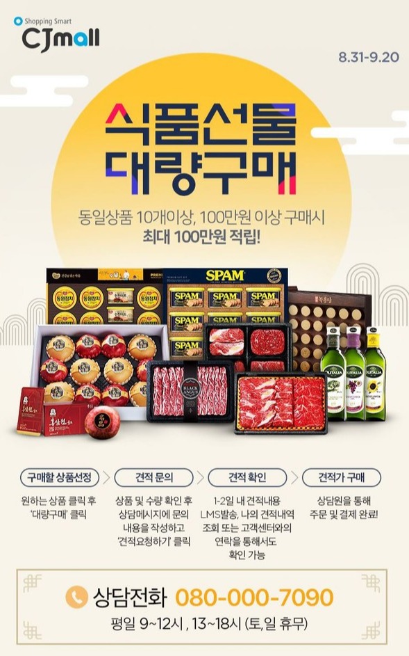 CJ오쇼핑 관계자는 “1대1 견적 서비스를 제공하고 있어 재구매율과 만족도가 높다”며 “맞춤 견적과 추가 적립금 혜택이 어려운 시기를 이겨내고 있는 회사와 가정의 명절 지출부담에 조금이나마 도움이 됐으면 좋겠다”고 말했다.