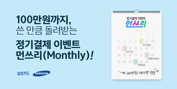 삼성카드는 오는 30일까지 ‘개인 맞춤형 정기결제 서비스’ 오픈을 기념 해 이벤트를 진행한다. 삼성카드 홈페이지에서 이벤트에 응모한 뒤 정기결제 서비스 1건 이상 신청 후 납부하면 추첨을 통해 최대 100만 원의 캐시백을 제공한다. 정기결제 이용건수가 많을수록 캐시백 당첨 확률이 높아진다.