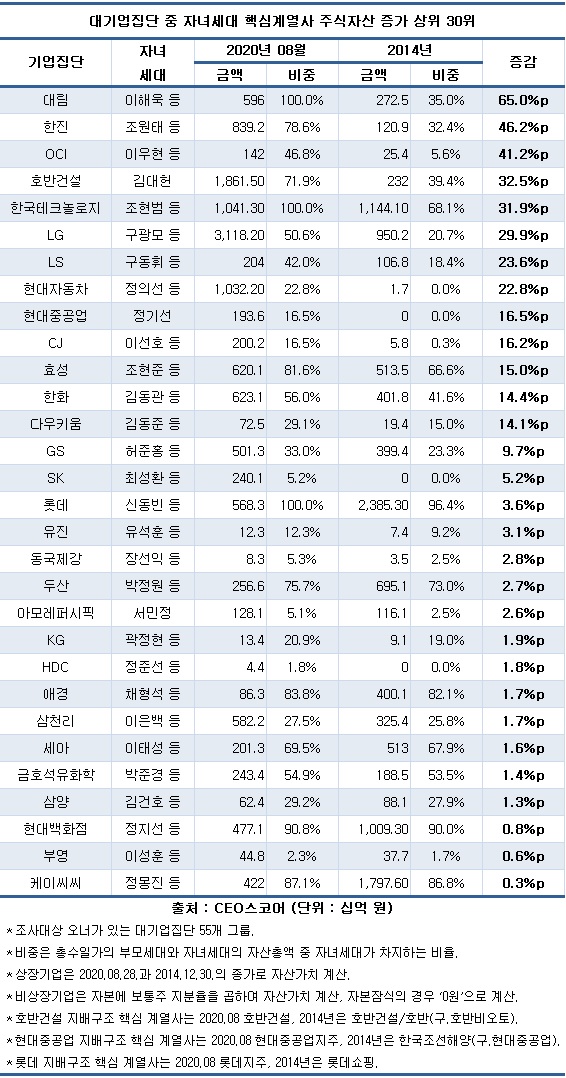 총수가 있는 55개 대기업집단 중 30곳에서 총수일가 자녀세대가 지난 5년간 그룹 지배구조 핵심 계열사에 대한 주식자산 비중을 확대한 것으로 나타났다.