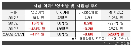 금융감독원 전자공시에 따르면 하림은 올해 상반기 이자비용이 68억 원을 기록한 데 비해, 영업이익은 41억 원 적자에 그치며 이자보상배율이 -0.61배를 기록했다.