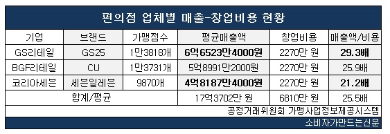 공정거래위원회에 가맹본부 현황자료를 제출한 GS리테일(GS25), BGF리테일(CU), 코리아세븐(세븐일레븐) 등 국내 편의점 3사의 지난해 가맹점 평균 매출은 17억3702만 원, 평균 창업비용은 6810만 원으로 집계됐다. 가맹점 매출이 평균적으로 창업비용의 25배를 넘긴 셈이다.