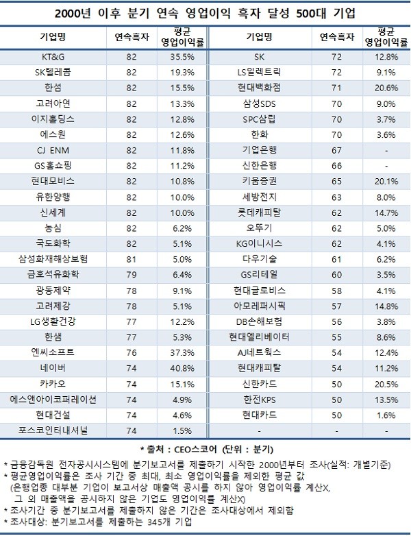 9일 기업평가사이트 CEO스코어(대표 박주근)가 금융감독원 전자공시시스템에 상장 기업들이 의무적으로 분기보고서를 제출하기 시작한 2000년부터 국내 500대 기업 345개 사의 영업이익(개별 기준) 추이를 조사한 결과, 한 분기도 빠뜨리지 않고 82분기 연속 흑자 행진을 하고 있는 기업은 13곳으로 집계됐다.