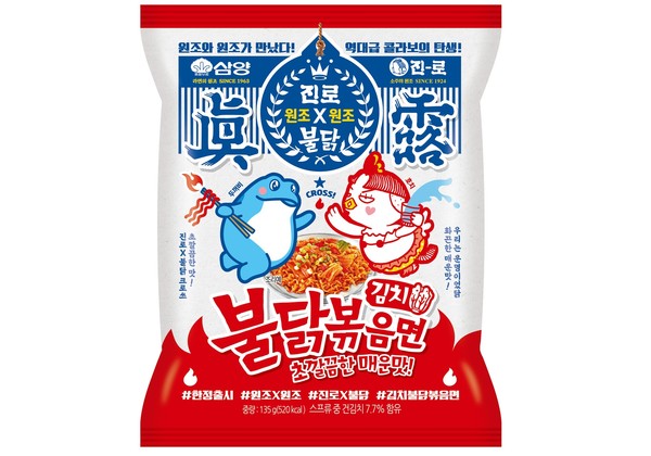 또 진로와의 협업으로 뉴트로 컨셉 한정판 디자인을 출시했다. 각 사의 과거 로고를 활용하고 전면에 불닭 캐릭터 ‘호치’와 진로 캐릭터 ‘두꺼비’를 배치했다는 설명이다. 한정판 패키지는 오는 10월까지만 생산된다.