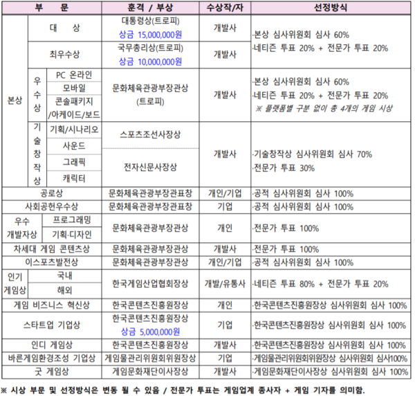 문화체육관광부가 주최하고 한국게임산업협회가 주관하며 전자신문·스포츠조선이 후원하는 이번 행사는 본상(대상·최우수상·우수상·기술창작상), 인기게임상 등 총 13개 부문을 시상한다. 대상은 상금 1500만 원, 최우수상은 1000만 원, 스타트업 기업상은 500만 원이 수여된다.