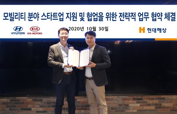 지난 30일 서울 드림플러스 강남에 위치한 현대기아차 제로원에서 열린 이날 협약식에는 현대해상 정규완 디지털전략본부장과 현대자동차 황윤성 오픈이노베이션투자실장 등 관계자들이 참석했다.