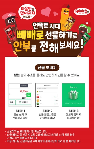 롯데제과는 올해 코로나로 인한 비대면 생활이 일상화되면서 오는 빼빼로데이에는 비대면으로 빼빼로를 전할 수 있는 온라인 ‘선물하기’의 이용률이 어느때보다도 급증할 것으로 전망했다.