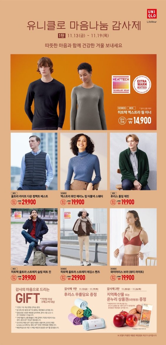 13일부터 19일까지 진행되는 감사제 1탄에서는 유니클로의 겨울철 대표 베스트셀러인 남녀 ‘히트텍 엑스트라 웜 크루넥T’, ‘히트텍 엑스트라 웜 터틀넥 T’와 남성용 ‘히트텍 엑스트라 웜 타이즈’, 여성용 ‘히트텍 엑스트라 웜 레깅스’를 1만4900원에, 유니클로의 스테디셀러 남성용 ‘후리스 풀짚 재킷’을 1만9900원에 선보인다.