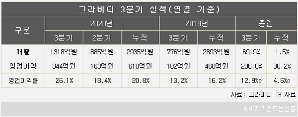 3분기 영업이익은 344억 원으로 전년동기 대비 236% 전분기 대비 110.6% 늘었다. 같은 기간 매출은 1318억 원으로 전년동기 대비 69.9%, 전분기 대비 49% 성장해 역대 분기 기준 두 번째를 기록했다.