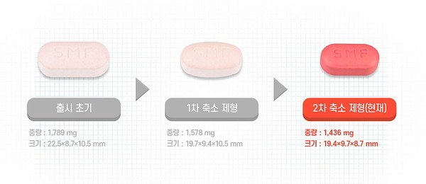 제형을 축소한 슈가메트 서방정 5/1000mg은 약효는 그대로 유지하면서 복약 편의성과 순응도를 높였다. 기존 대비 정제 길이를 DPP-4 저해제와 메트포르민 복합제 중 가장 짧은 19.4mm로 축소했으며 두께를 17% 가량 줄였다. 모양은 유선형으로 변경됐다.