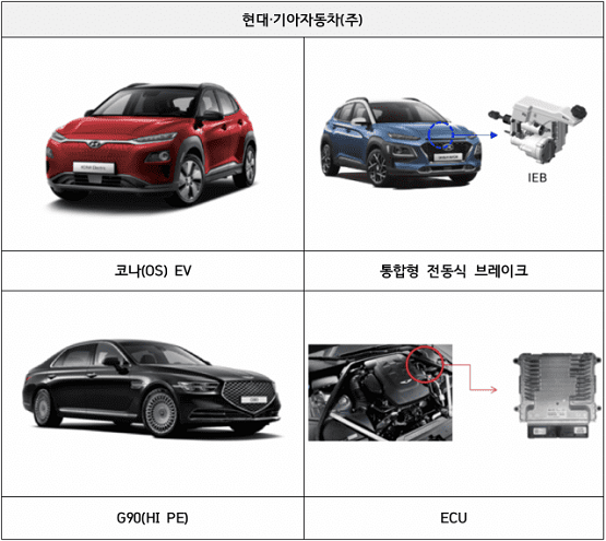 현대·기아차가 제작·판매한 코나 일렉트릭 등 4개 차종 5만2759대는 전동식 브레이크 시스템의 소프트웨어(SW) 결함으로 브레이크 경고등 점등 시 브레이크 페달이 무거워져서 제동이 제대로 되지 않을 가능성이 확인됐다.