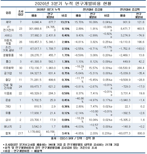 9일 기업평가사이트 CEO스코어(대표 박주근)가 국내 500대 기업 중 분기 보고서를 제출하고 R&D 비용을 공시하는 217개 기업을 조사한 결과, 올해 들어 3분기까지 이들 기업의 R&D 비용은 총 40조1561억 원으로 작년 동기(39조3561억 원) 대비 2%(8000억 원) 증가했다.