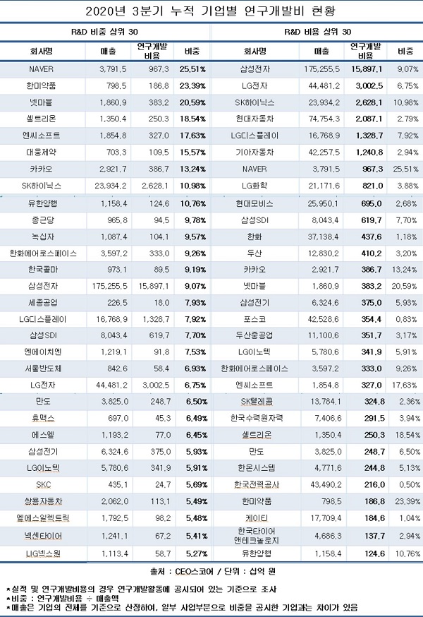 기업별로는 네이버가 매출 3조7915억 원 중 25.51%(9673억 원)를 R&D에 투자해 조사대상 기업 중 비중이 가장 높았다. 한미약품(23.39%), 넷마블(20.59%)도 매출의 20% 이상을 R&D에 썼고 △셀트리온 18.54% △엔씨소프트 17.63% △대웅제약 15.57% △카카오 13.24% △SK하이닉스 10.98% △유한양행 10.76% △종근당 9.78% 등이 R&D 비중 ‘톱10’을 형성했다.