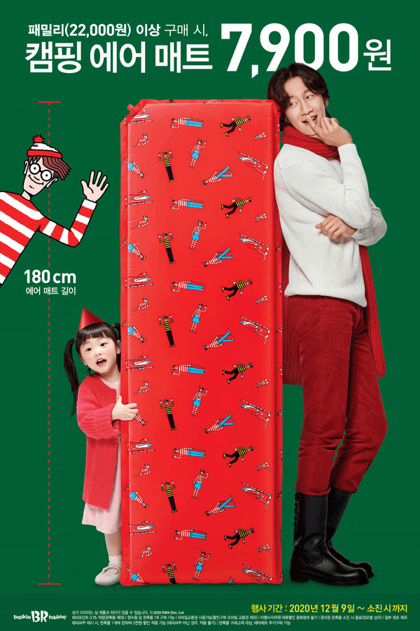 배스킨라빈스가 선보이는 ‘월리 자동충전식 캠핑 에어매트’는 크리스마스 느낌이 나는 레드 컬러에 그림책 ‘월리’ 캐릭터가 다양하게 그려진 매트다.