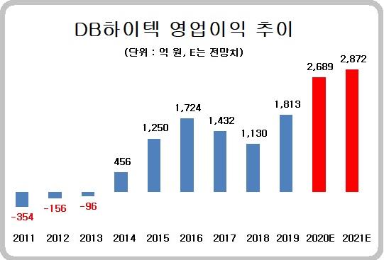 DB하이텍은 반도체 사업 진출 13년 만인 2014년에야 영업이익을 내기 시작했고, 2015년부터 지난해까지 5년 동안은 줄곧 1000억 원대의 영업이익을 기록했다.