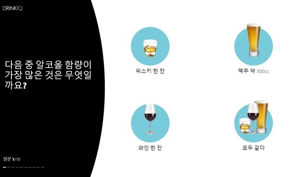 드링크아이큐 퀴즈는 알코올이 남성 또는 여성에 미치는 영향 차이, 주종별 알코올 함량 등 건전한 음주습관에 도움이 될 수 있는 10가지의 문제로 이뤄져 있다.