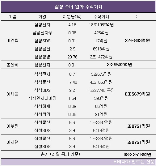이건희 회장은 삼성전자(4.18%), 삼성전자우(0.08%), 삼성SDS(0.01%), 삼성물산(2.90%), 삼성생명(20.76%) 지분을 보유했다. 4개월 간 종가 평균으로 계산한 주식가치는 18조9249억 원이다.