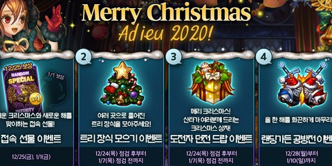 크리스마스 기념 이벤트도 진행된다. '메리크리스마스! 아듀 2020!' 이벤트는 25일 크리스마스 당일 게임에 접속한 모든 유저들에게 '스페셜 인피니티 카드x4 소환권 1장'을, 내년 1월 1일 새해 첫 날 게임에 접속한 모든 유저들에게 '프리미엄 9회 소환권 1장'을 지급한다.