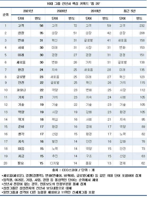 5일 기업평가사이트 CEO스코어(대표 박주근)가 국내 10대 그룹의 2021년 신년사 키워드 빈도수를 조사한 결과, ‘고객’이 56회로 가장 많이 언급된 것으로 집계됐다.