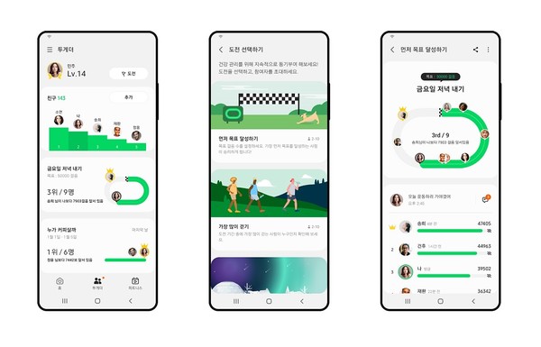 기존 1:1 걸음 수 대결에서 본인 포함 최대 10명까지 대결을 할 수 있게 됐다. 전 세계 삼성 헬스 사용자와 함께 걸음 수 대결을 진행하는 글로벌 도전 기능은 현재와 같이 즐길 수 있다.