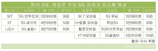 5G 요금제만 봐도 3~4만 원 대 저렴한 요금제가 많다. SK 7모바일, KT M모바일, 헬로모바일, U+알뜰모바일 등 주요 알뜰폰 업체들이 출시중인 가장 저렴한 5G 요금제는 3만 원 후반대에 집중돼 있다.