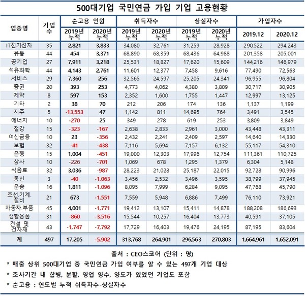 지난해 500대 기업의 국민연금 신규 취득자는 26만4901명, 국민연금 가입 자격 상실자는 27만803명으로 각각 집계됐다. 순고용인원(취득자수-가입자수)은 –5902명이다.
