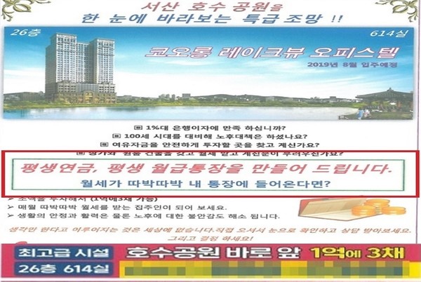 또 두 업체는 ‘평생연금 월 100만원’ ‘평생 월급통장을 만들어드립니다’ 등의 표현을 사용해 안정적인 임대수익을 보장하는 것처럼 광고했다. 하지만 공정위는 “월 임대료는 두 회사가 단순 예상한 것에 불과하고 실제 임대수익을 보장할 수단은 없었다”고 판단했다.