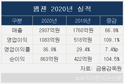 4분기만 보면 매출은 925억 원으로 전년동기 대비 111% 늘었다. 영업이익과 순이익은 387억 원과 306억 원으로 각 163.2% 232.3% 증가했다.