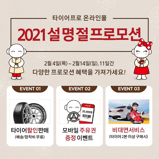 타이어프로 홈페이지 온라인몰에서 이벤트 페이지를 통해 주요 프리미엄 제품(TA31, TA91, PS31, PS71, KL33, HP71)을 구매한 고객에게는 20%를, 온라인몰 전용제품(KU27)의 경우 최대 35%의 할인 혜택을 제공한다.